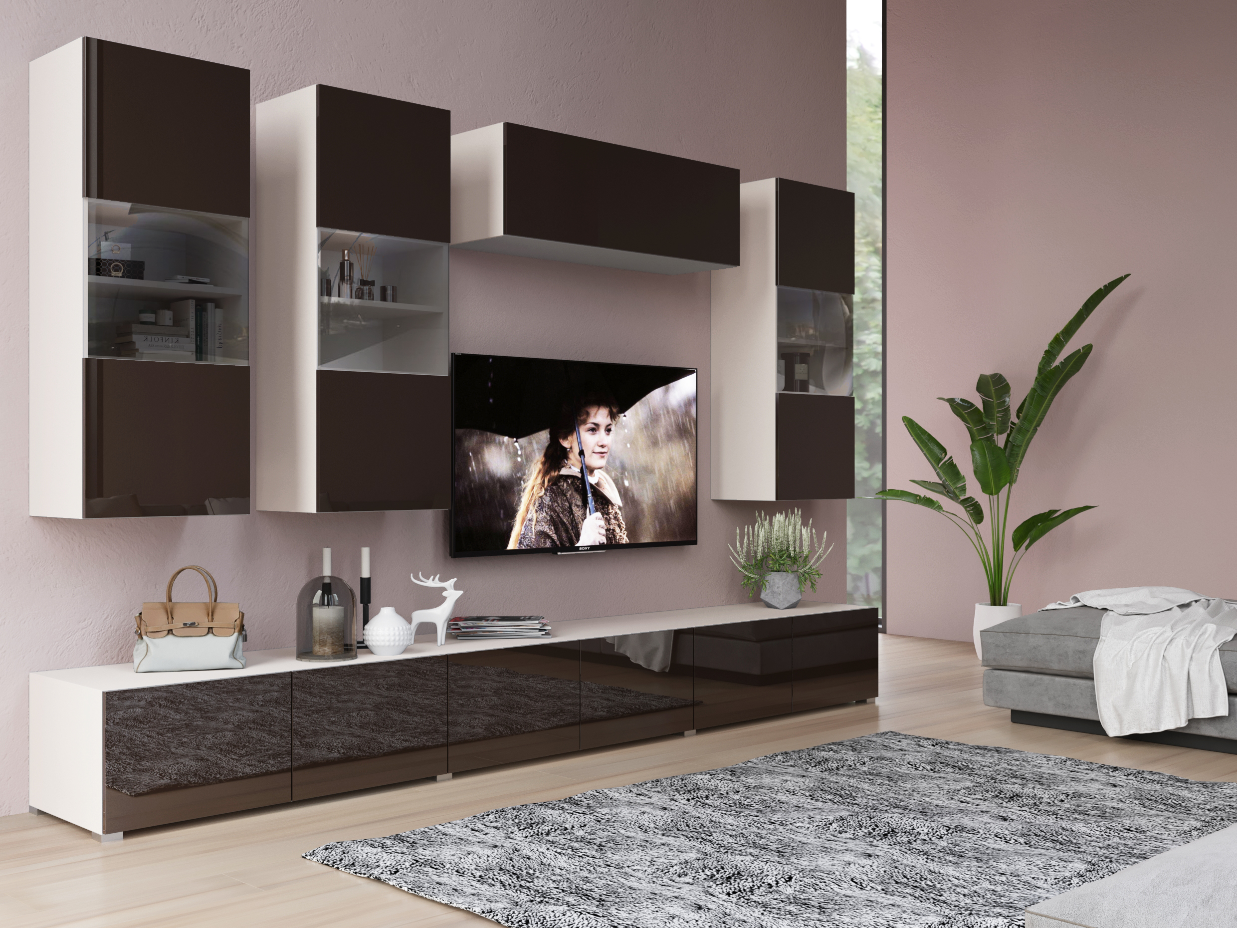 Тумба под ТВ: 3 секции, двери открываются вниз на барных кронштейнах. Шкаф навесной вертикальный: за распашной дверью 3 полки. Шкаф навесной горизонтальный: дверь открывается вверх на газлифте. Открытие дверей по нажатию push to open.