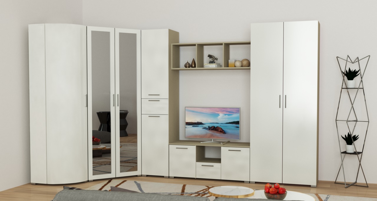 Колонка радиусная: 4 полки. Шкаф угловой: комбинированный платье (полка сверху + полка снизу + штанга)/белье 4 полки. Колонка комбинированная: 1 выдвижной ящик. Тумба ТВ: 2 распашные двери по центру, выдвижной ящик. Направляющие ящиков шариковые 100% полного выдвижения. Шкаф 2-х дверный: платье (полка сверху + полка снизу + штанга).